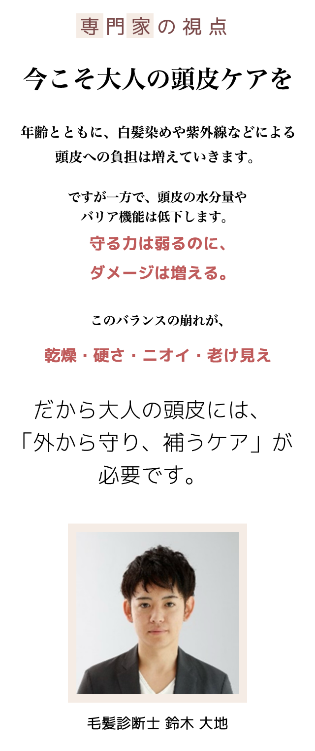 お顔のケアだけでなく、体の最上部にある頭皮からのスキンケアが美しさへの近道です。